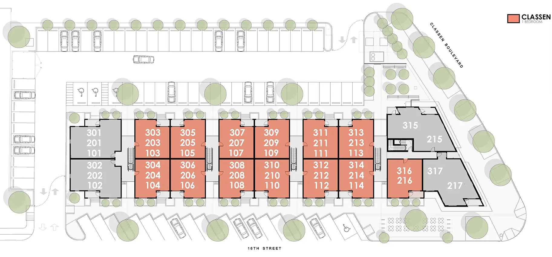 The namesake floor plan for Classen 16! This thoughtfully designed open floor plan features all stainless steel appliances, quartz countertops, soft-close cabinetry, massive windows with roller shades, and many more premium finishes. Only need a one-bedroom but still want the flexibility to entertain? We have you covered! Transform your space in minutes for dinner parties, game nights, or get-togethers with the flexibility of your mobile kitchen island! Have your choice of first-floor convenience with a front porch, a second-floor elevated view with a private balcony, or the luxurious 3rd floor with a 16’ living room ceiling and sky window (and of course, a private balcony)! As our friend Ron Burgundy would say, “You stay classy." (*Pending friend request with Ron. He probably just hasn't seen it yet.)